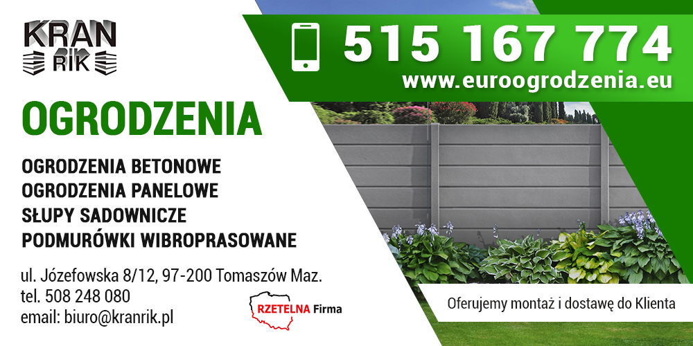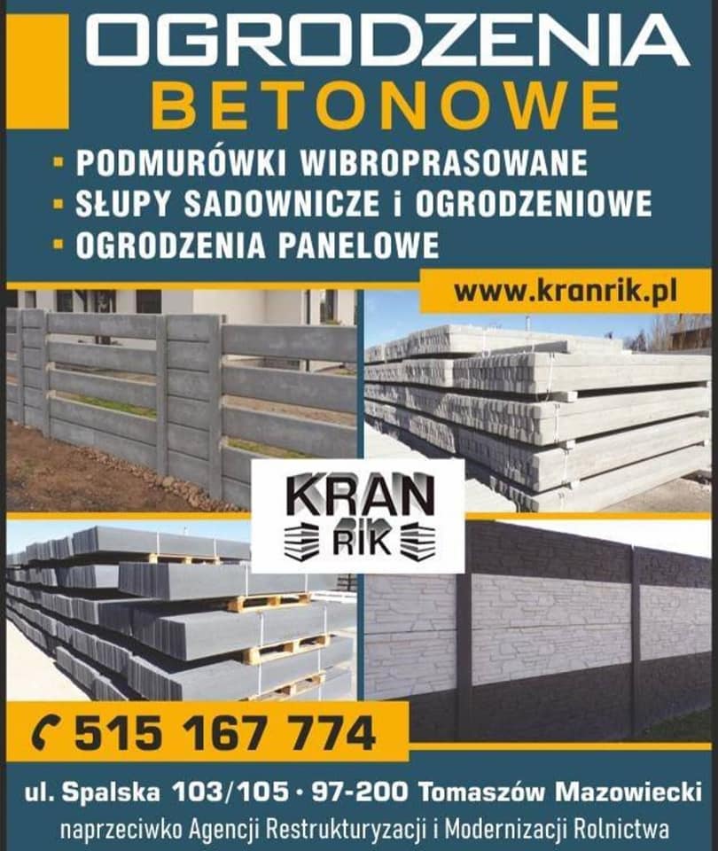 Siedziba firmy  PPHU KRAN RIK mieści się przy ulicy Józefowskiej 8/12 w Mińsku Mazowieckim, PPHU KRAN RIK to producent ogrodzeń systemowych. Ponad dwudziestoletnie doświadczenie w branży, to gwatancjaznajomości potrzeb Klienta i najwyższej jakości produktu. Nasz asortyment to: - Ogrodzenia betonowe - Nowoczesne ogrodzenia panelowe - Daszki na słupki  oraz na podmurówki - Siatka ogrodzeniowa - Podmurówki - Bramy i furtki - Słupy sadownicze - Europłoty W trosce o wygodę naszych Klientów oferujemy dostawe do oraz montaz zakupionych produktów. Atutem zakupów u nas i  skorzystania z naszych usług są również atrakcyjne ceny. Zapraszamy!